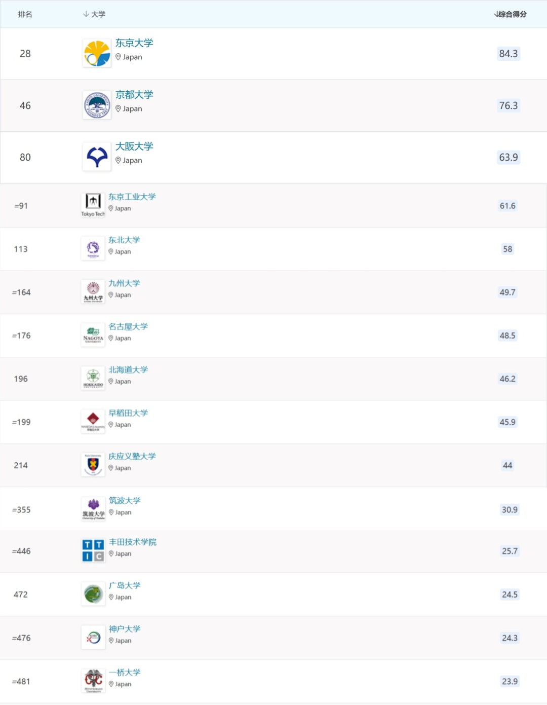 2024年的QS世界大学排名中,日本共有50所大学上榜。在全球排名Top500中,日本共上榜15所。其中排名前100名的共4所学校,分别为:
