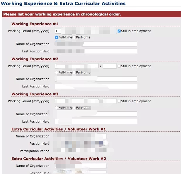 这快按照时间的倒序来填写就可以。网申系统里只能填写五段经历(三个工作经验,两个课外活动经历),选择最有分量或时间跨度最长的来填写。