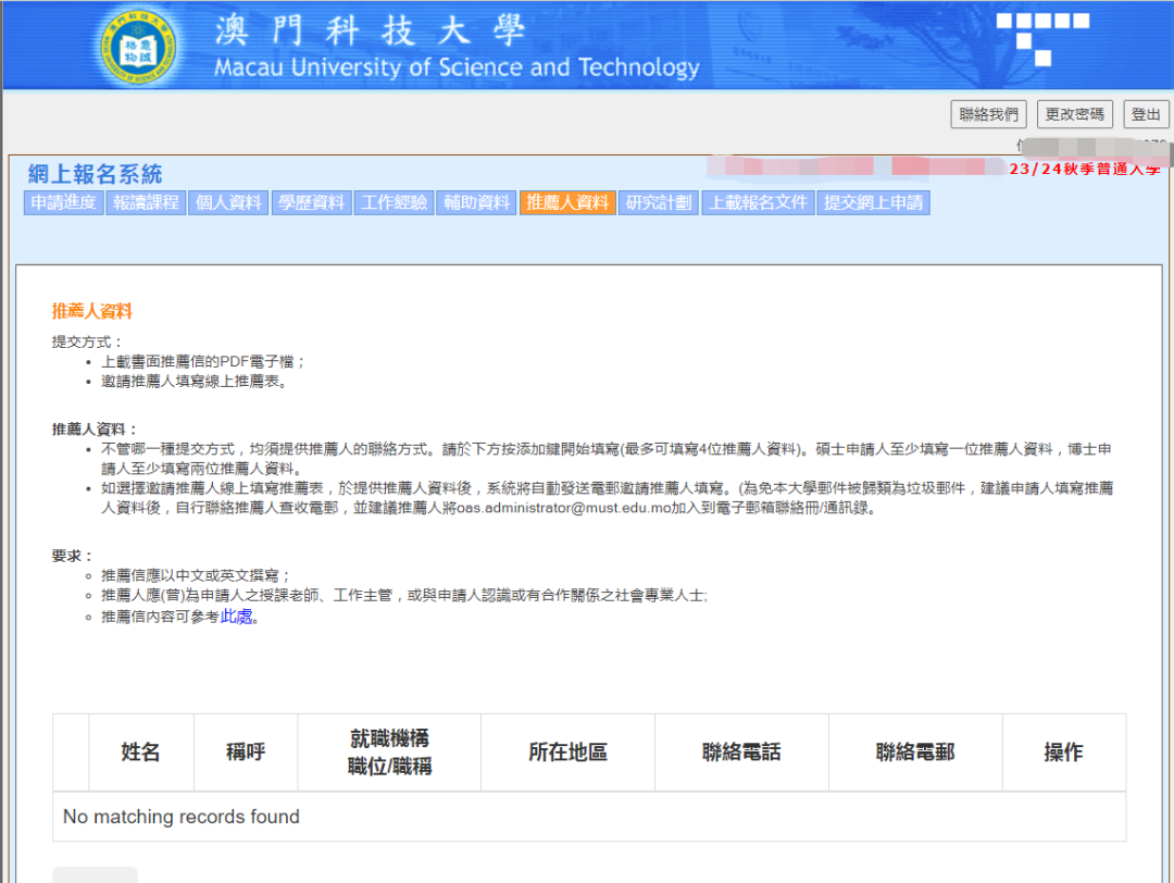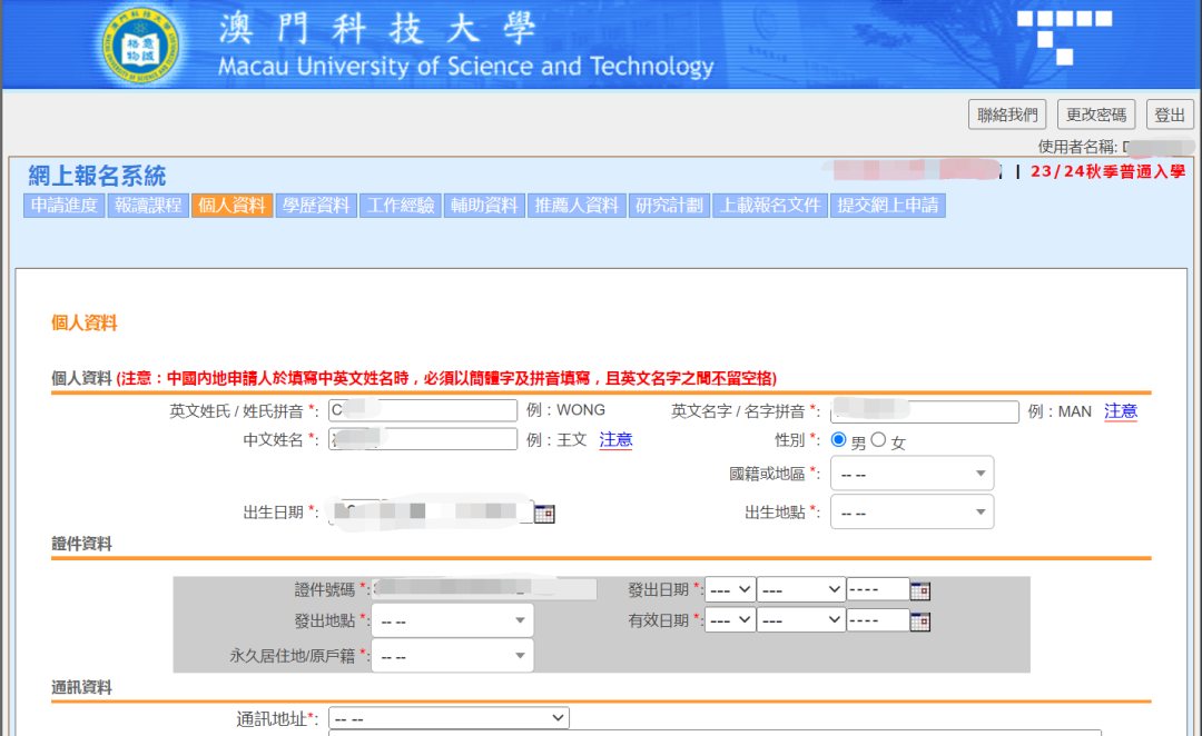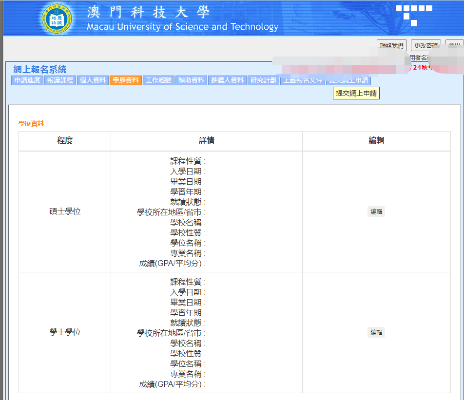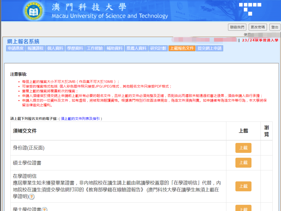 澳科大的网申系统就更简单了,都是中文,跟着流程基本上也都会。因为硕士申请通道已经关闭,我就用博士申请的通道给大家展示,都是一样的(博士会多一个研究计划书)。