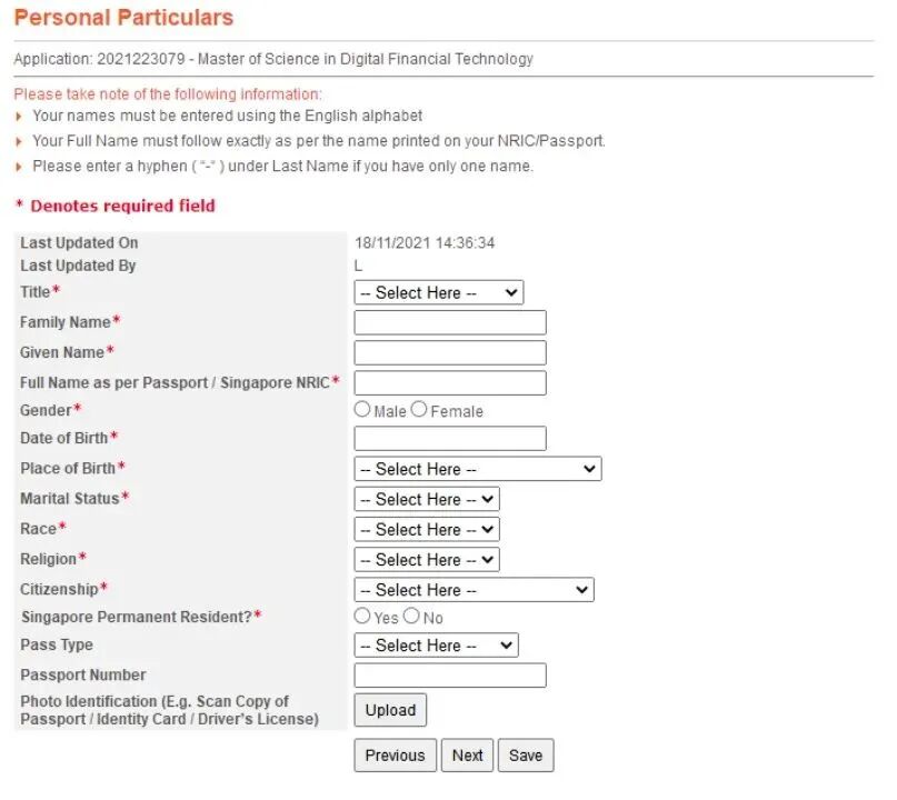 点击左侧的“Personal Particulars”开始填写个人信息。